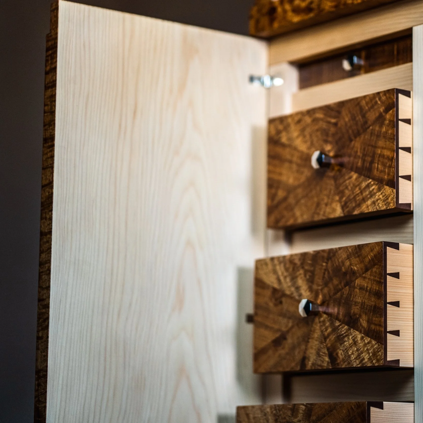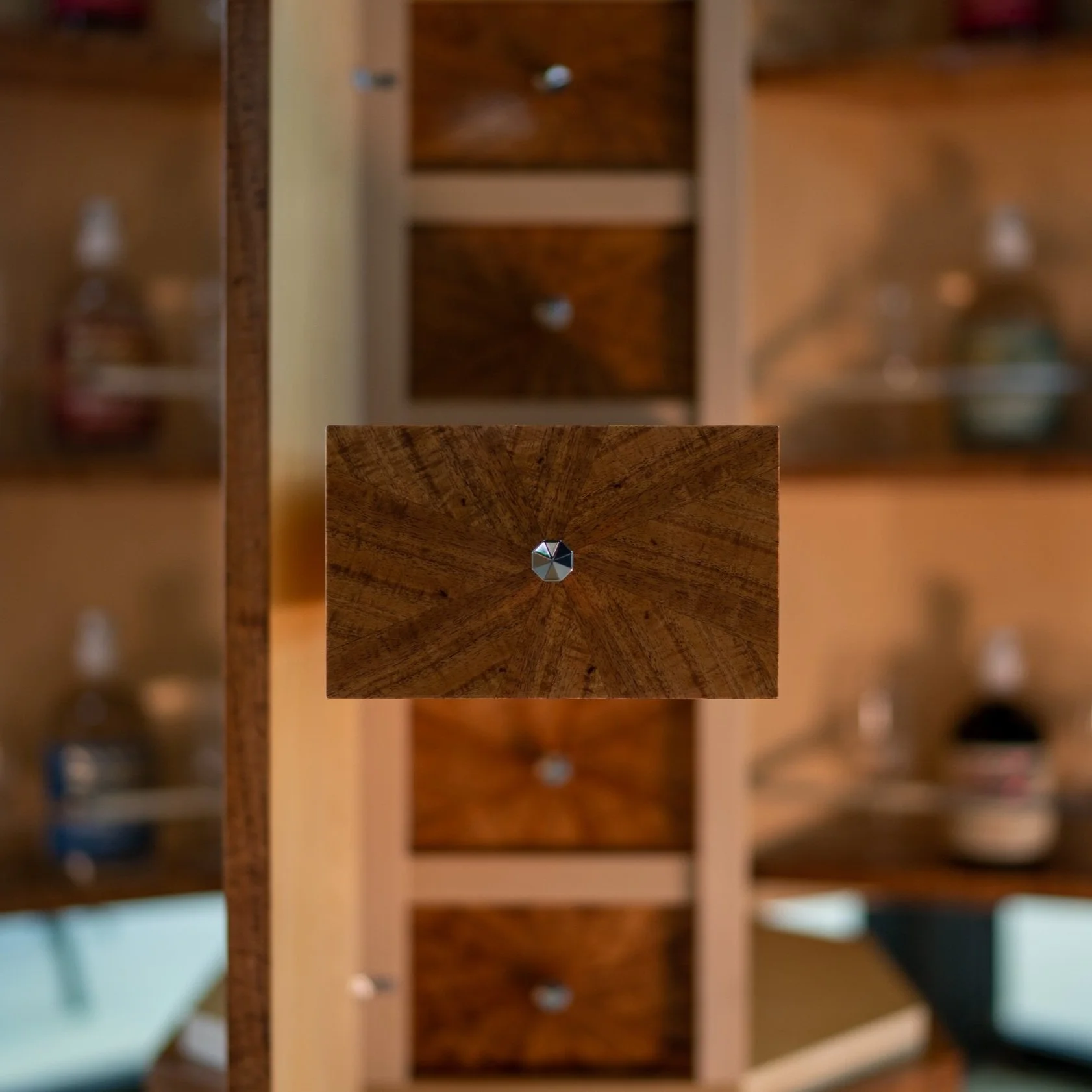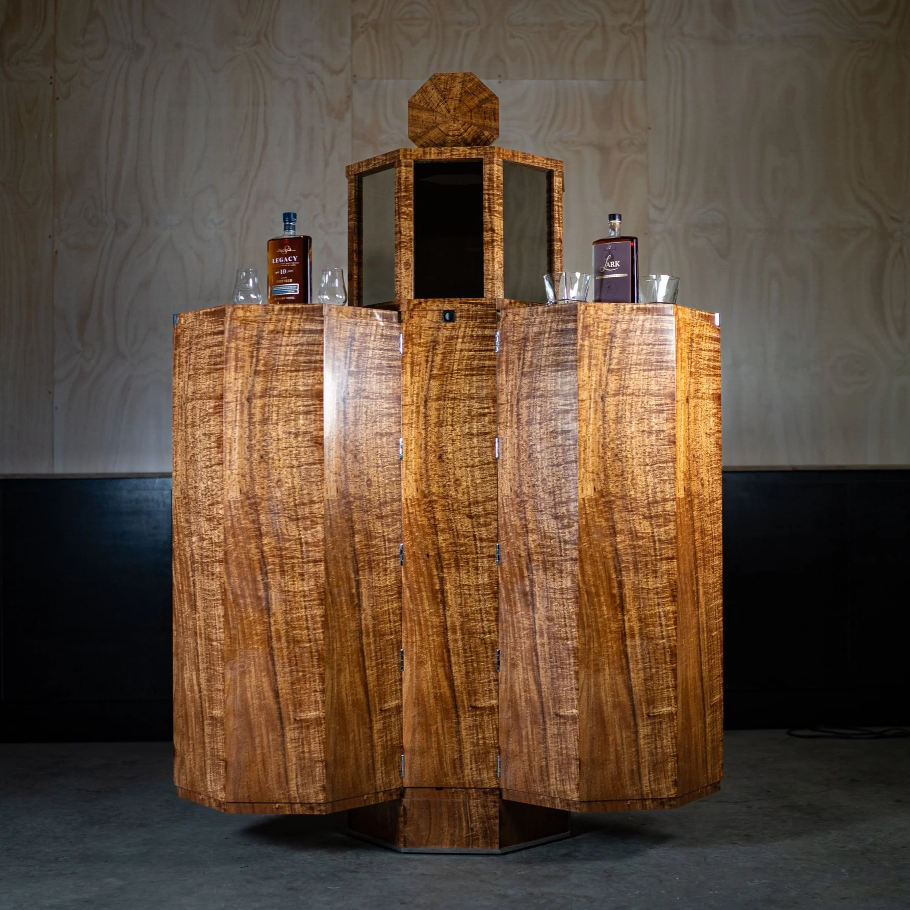 The liquor cabinet features a suite of Pete’s craftsmanship techniques including the infinity model, secret compartments, traditional French polishing, finely dovetailed drawers, mirror polished stainless steel and highly figured blackwood decorative veneering.